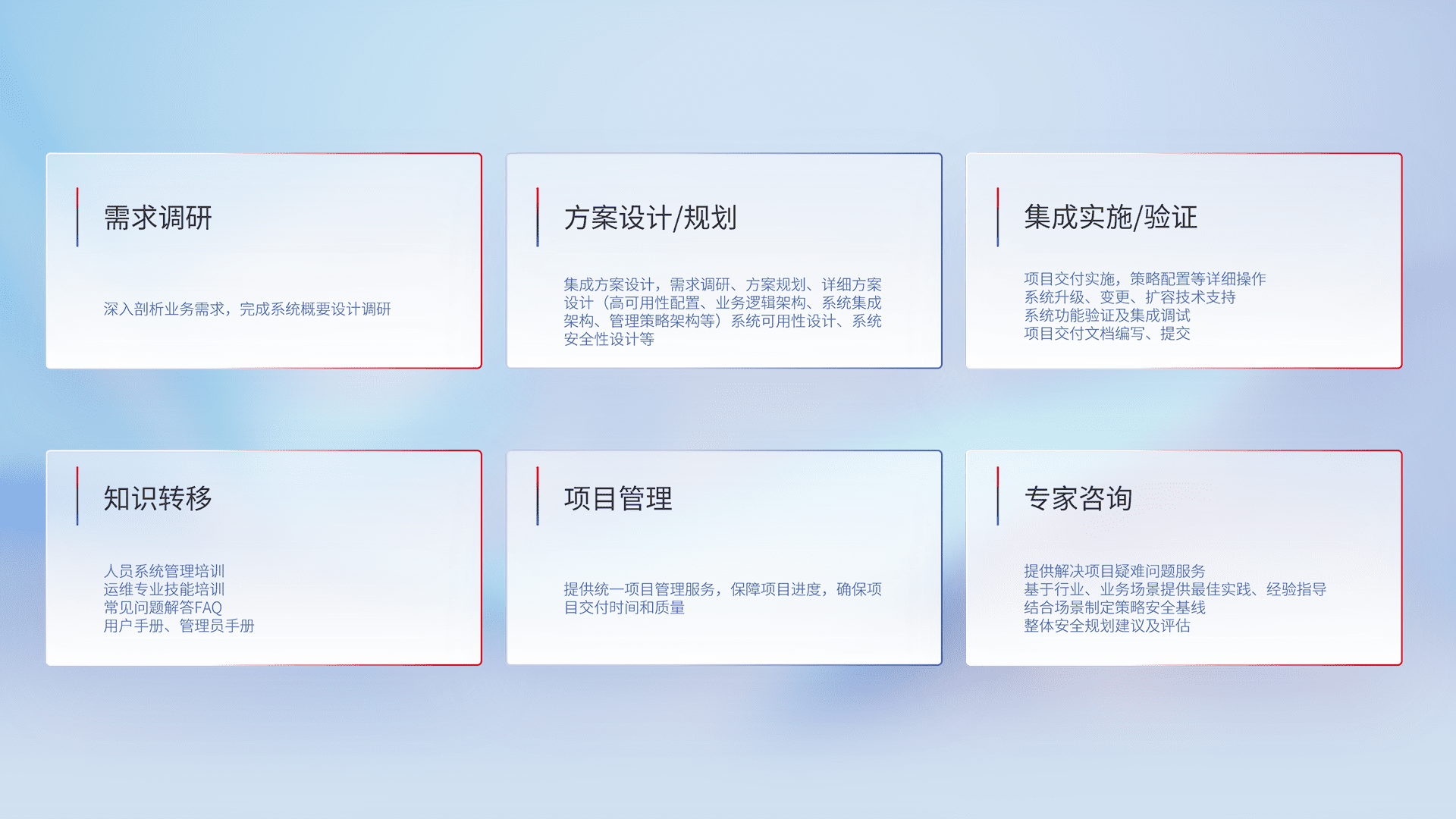 针对客户行业特性,,,将宏观的安全战略和需求,,,,通过专业的交付服务,,,,实现项目落地,,,,为客户提供标准规范的集成交付服务。。。